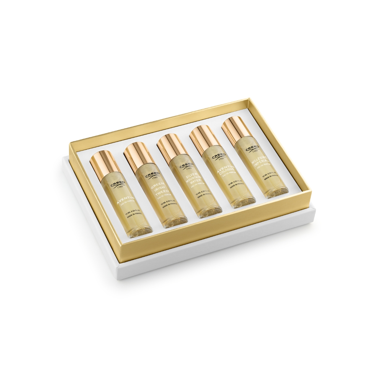 Questo set regalo da uomo composto in edizione limitata riunisce cinque celebri fragranze da 10ml della Maison Creed: Aventus, Aventus Cologne, Silver Mountain Water, Green Irish Tweed e Millésime Impérial. Ciascuna è presentata in una raffinata edizione da 10 ml. Racchiuso in una raffinata confezione verde smeraldo ispirata all'audace eleganza del design Art Déco, questo set regalo è espressione di maestria artigianale e intenzionalità ed è pensato per essere il regalo più memorabile.